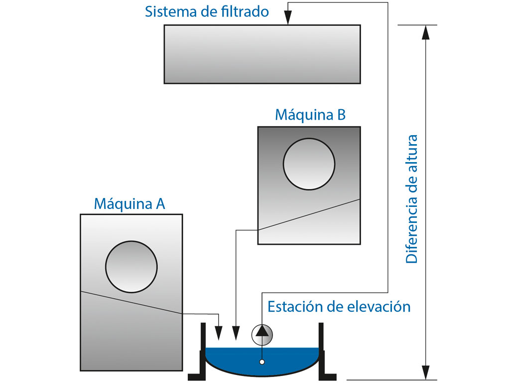 Las estaciones de elevación POLO son equipos auxiliares necesarios para transportar líquidos contaminados con un alto contenido de virutas desde un sistema de filtración. El diseño especial (flujo de entrada tangencial) garantiza que el medio que contiene las virutas llegue directamente a la aspiración de la bomba. Esto minimiza los depósitos de virutas en la estación de elevación.