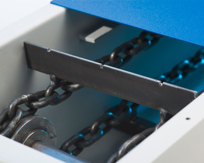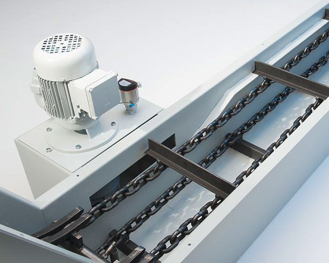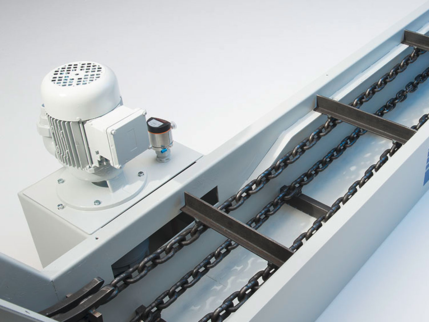 Kratzwinkel gleiten über den Behälterboden und erfassen die Späne über die gesamte Trogbreite. Die sedimentierten Späne werden restlos abtransportiert. Aufgrund der ebenen Seitenwände ist die Bildung von Späne-Nestern ausgeschlossen. Schlitze in den Kratzwinkeln