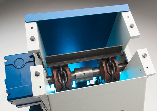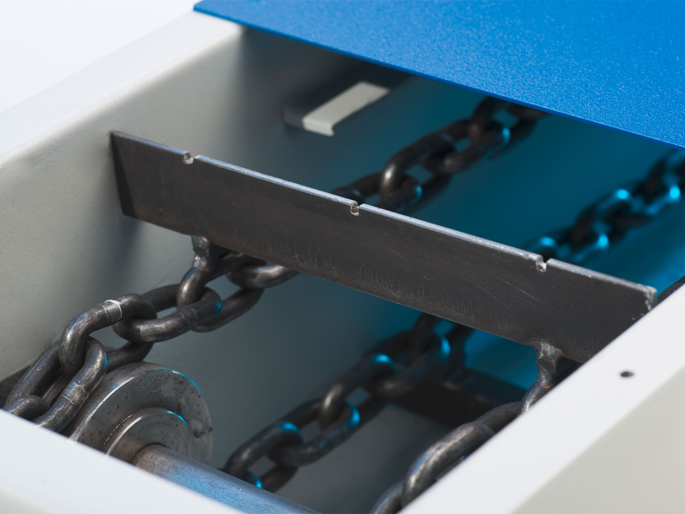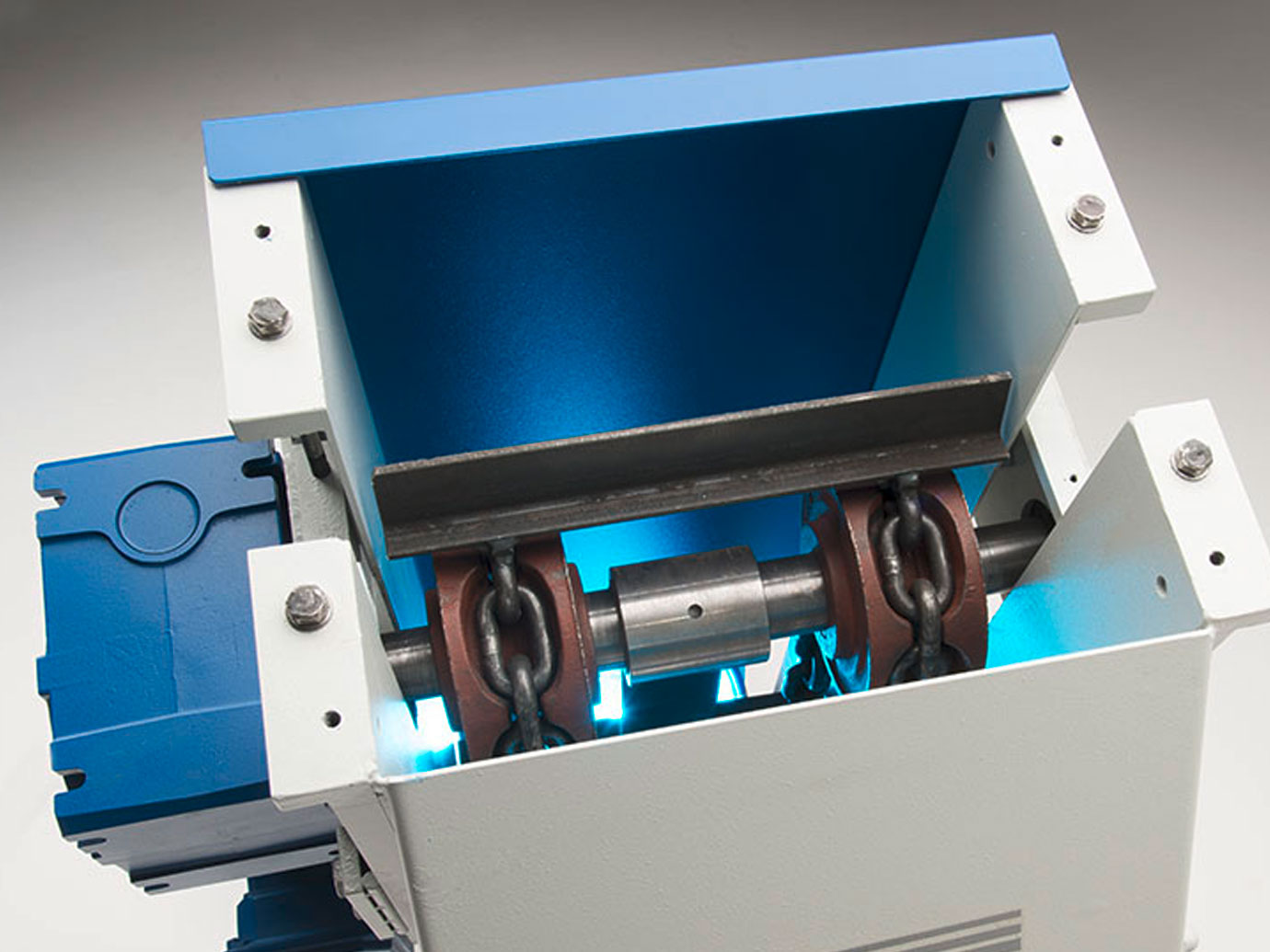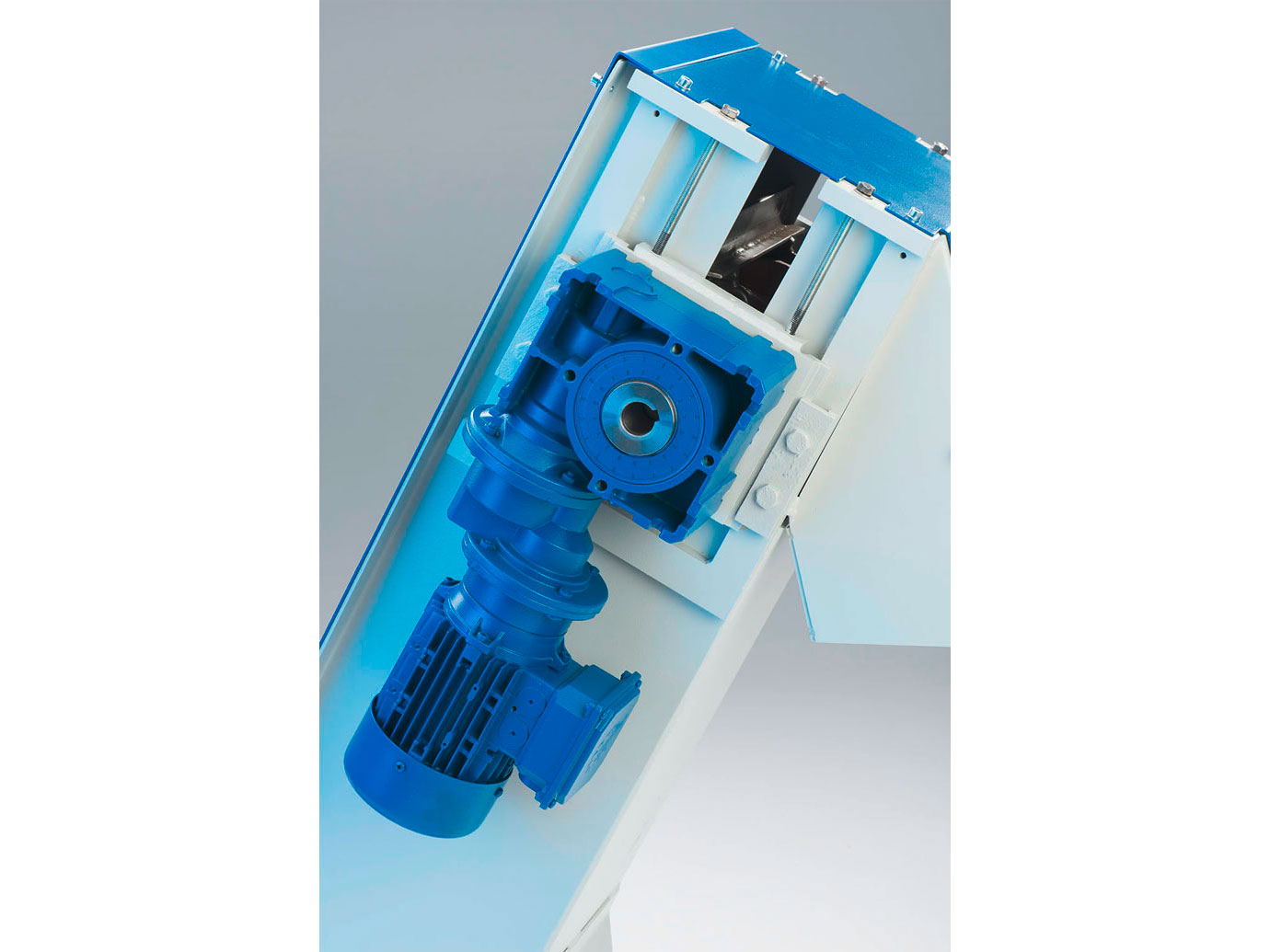 Der Antrieb erfolgt über einen Drehstrom-Getriebemotor. Die Spannstation der Förderkette befindet sich am Abwurfkopf und ist damit im eingebauten Zustand leicht zugänglich. Robuste Taschenräder gewährleisten einen verschleißarmen Transport der Förderkette.