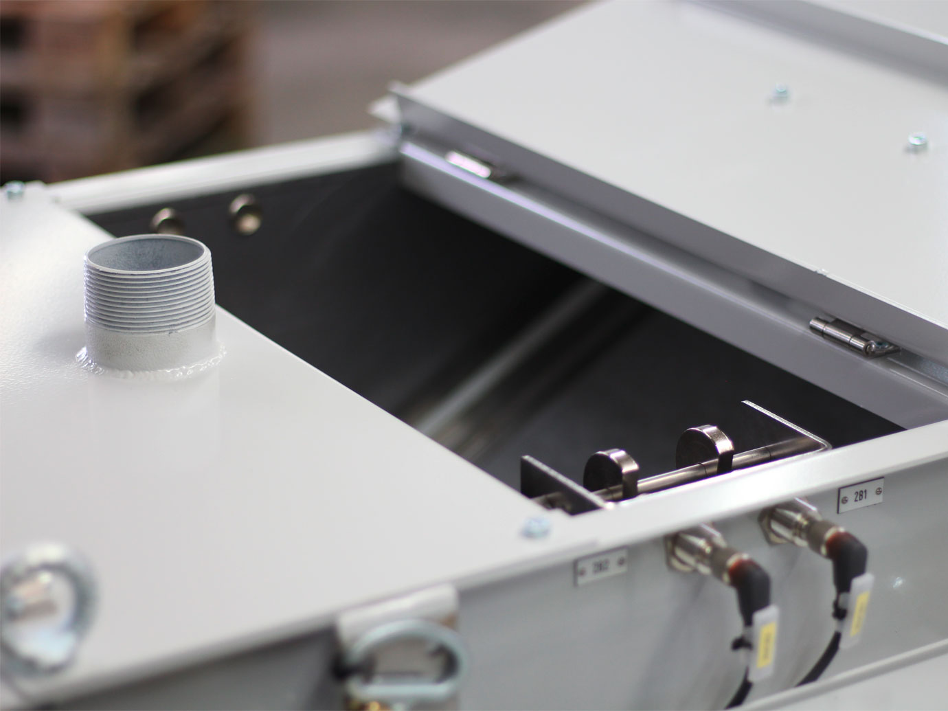 Die Flüssigkeit wird dem Filter über den Einlaufverteiler drucklos zugeführt, durchfließt das Filtervlies und gelangt gereinigt über den Auslauf in einen darunter stehenden Reintank.